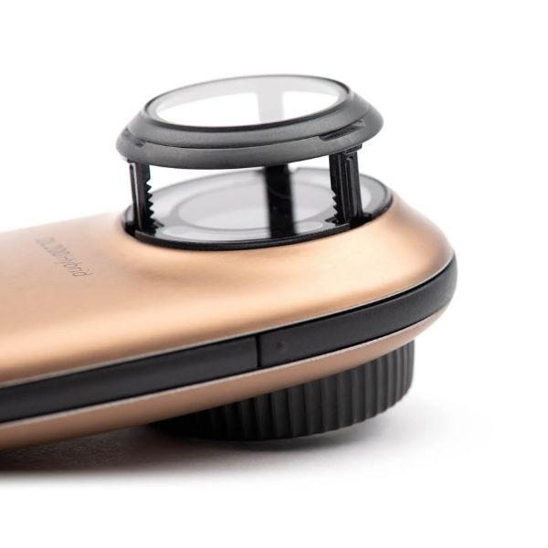Dispositivo ergonómico con acabado de metal dorado o plateado. Fácil de limpiar, con el sistema óptico del DL2. Integra un mecanismo espaciador retráctil, súper rápido e innovador con enfoque preciso. Compatible con IceCap® (tapas de control de infecciones). Batería larga duración. Conectividad MagnetiConnect® con smartphones integrada